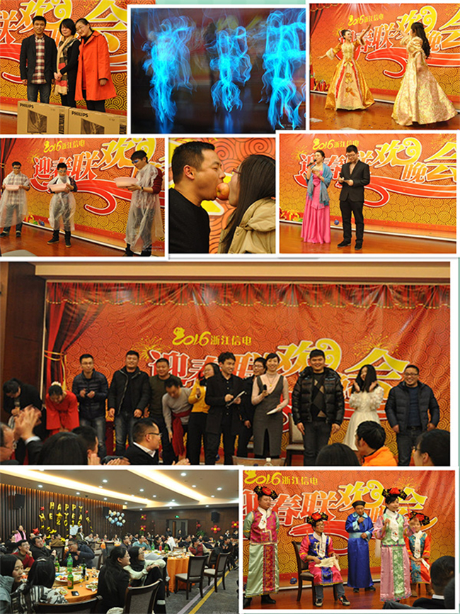 当晚,信电人精心筹划的2016迎新联欢晚会在一派欢乐祥和的乐曲声中拉开帷幕!本次晚会内容丰富,节目、游戏、抽奖花样繁多。歌舞、相声、小品、器乐演奏等节目轮番登场。集成事业部的《荧光舞》充满了科技感与活力;维修维护组的小品《信电联播》写实与捧逗结合,说尽了信电工作人员的尽职尽责;出租车电召中心的情景剧《王子也疯狂》在搞笑中耍文艺,让人忍俊不禁;软件组的歌曲串烧,将IT男的职场生活唱了出来,有欢喜有无奈;综合组的小品《甄嬛后传》更是角色反串,笑料频出引发爆笑不断。除了团体节目以外,张鸣的吉他弹唱、周薇的独唱歌曲也是温暖人心,实力满满!晚会中激动人心的游戏及抽奖环节将现场气氛一次次推向高潮。大家吃的开心,玩得尽兴。整场晚会及晚宴将“团队”及“家宴”这两个饱含温暖的词语诠释的淋漓尽致。